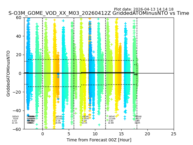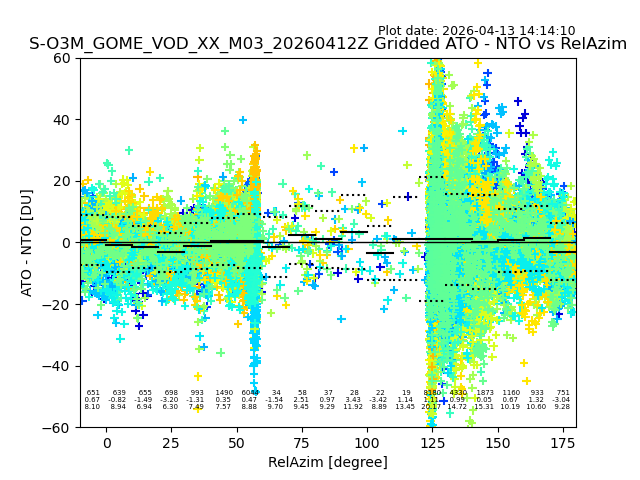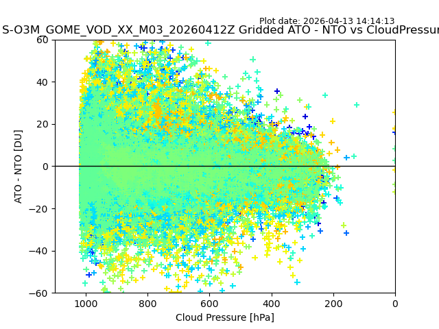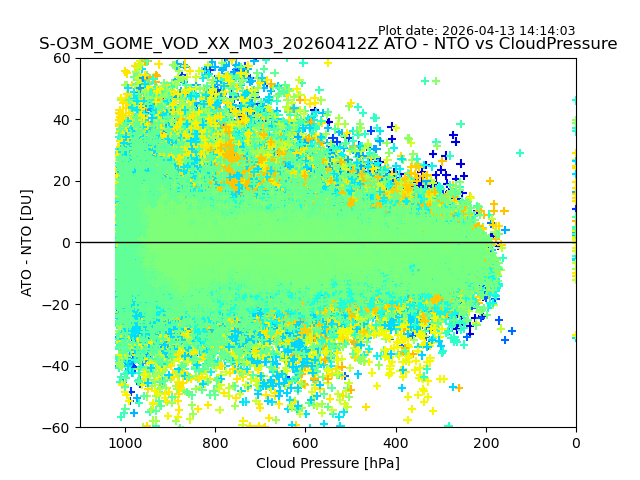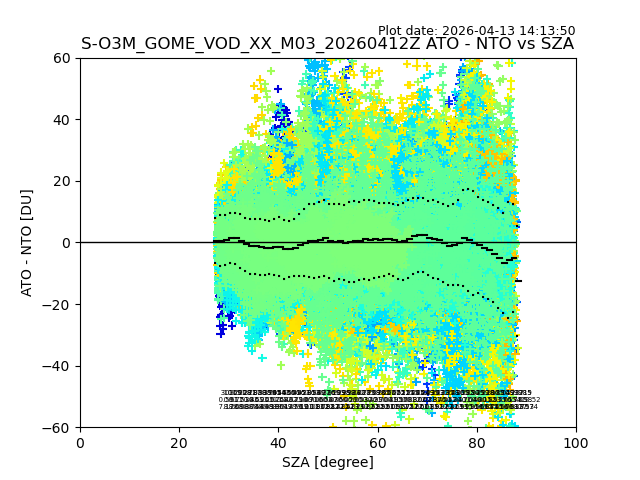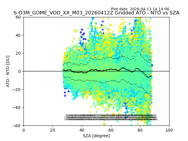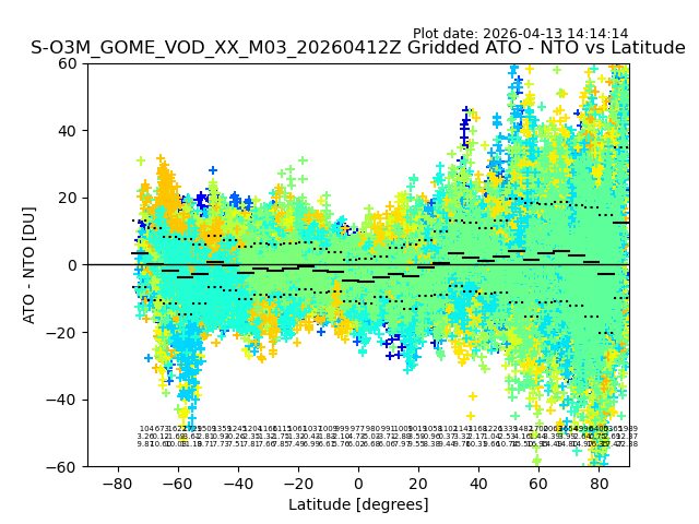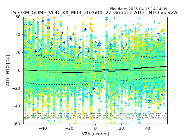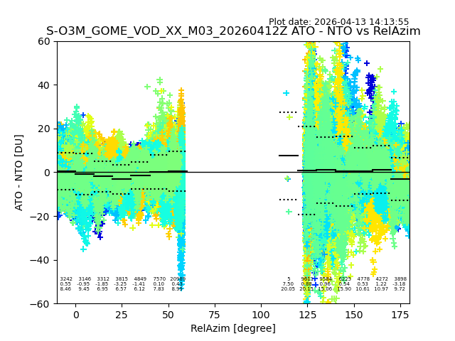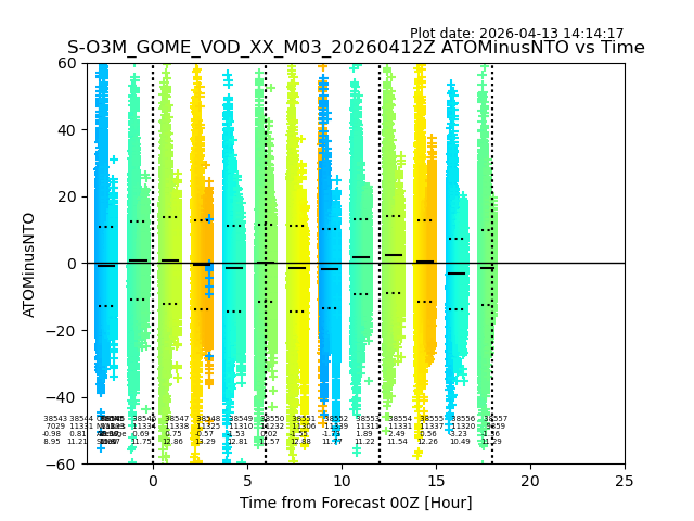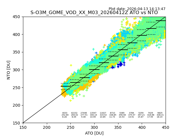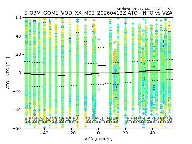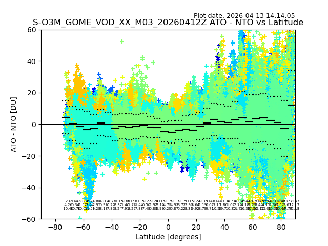 The date given in the title of the plot indicates the T=0 day for which the NTO/O3 data is compared. Example: S-O3M_GOME_VOD__M02_20110117Z indicates that the plot is for data from 2011-01-17 00:00 up NTO/O3 files starting at 2011-01-17 23:59 is used.