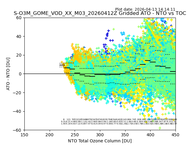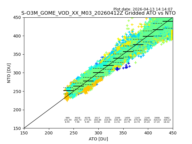 Using these forecast fields, the actual measured NTO/O3 from T=0 to T+24h can be compared. The comparison can be between each individual NTO/O3 retrieval and the ATO value in the associated grid box, or between 'pre-gridded' NTO/O3 values and the ATO value. Both these comparisons are given.