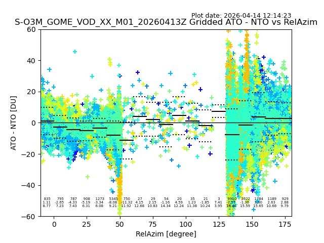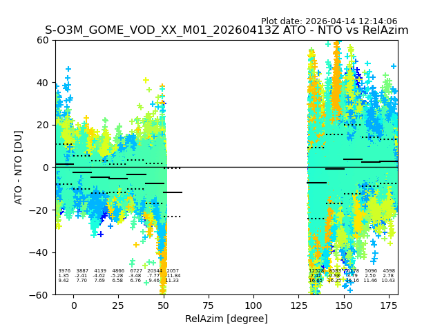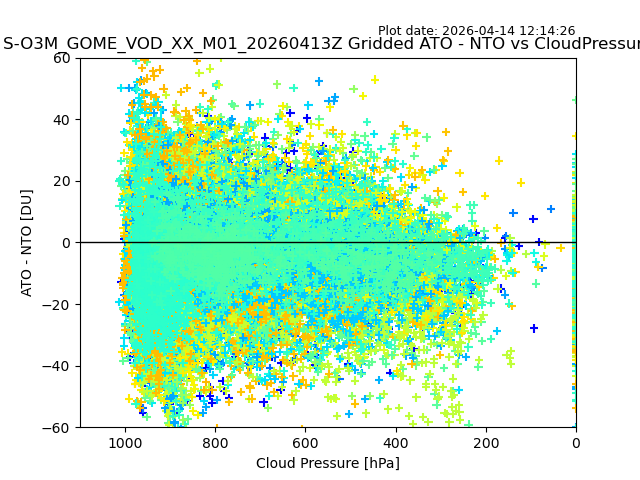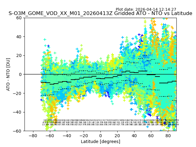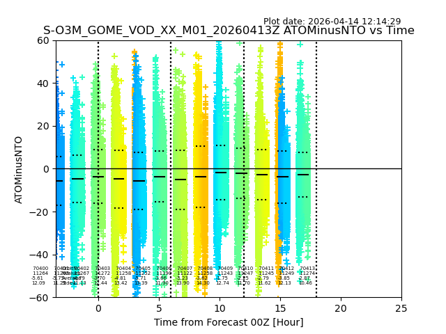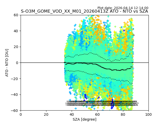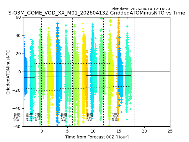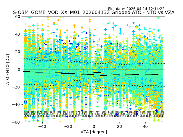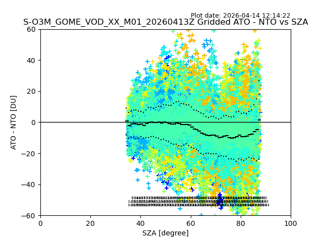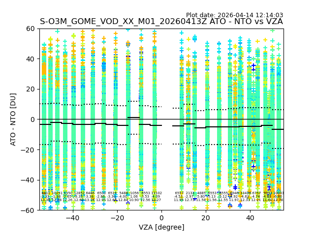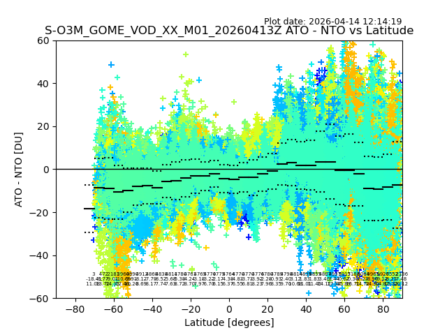 The date given in the title of the plot indicates the T=0 day for which the NTO/O3 data is compared. Example: S-O3M_GOME_VOD__M02_20110117Z indicates that the plot is for data from 2011-01-17 00:00 up NTO/O3 files starting at 2011-01-17 23:59 is used.