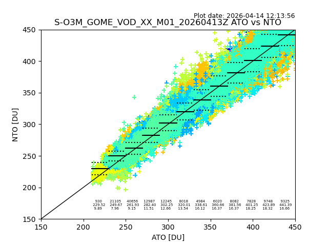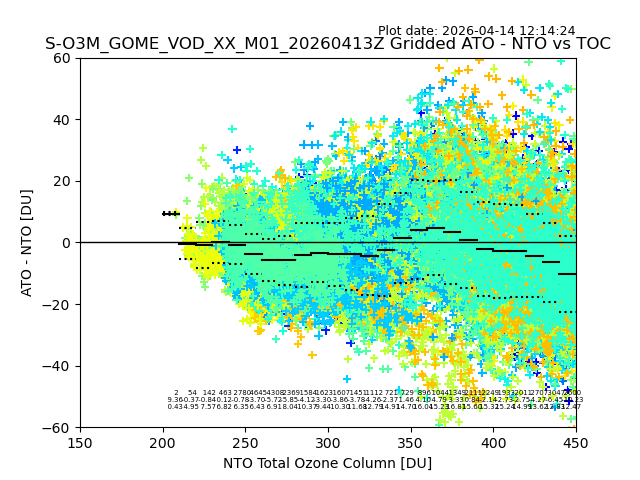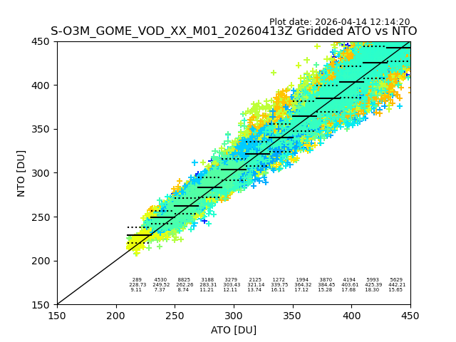 Using these forecast fields, the actual measured NTO/O3 from T=0 to T+24h can be compared. The comparison can be between each individual NTO/O3 retrieval and the ATO value in the associated grid box, or between 'pre-gridded' NTO/O3 values and the ATO value. Both these comparisons are given.