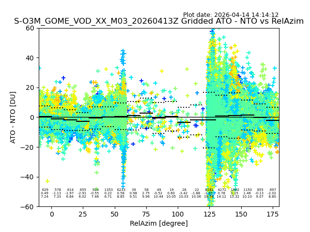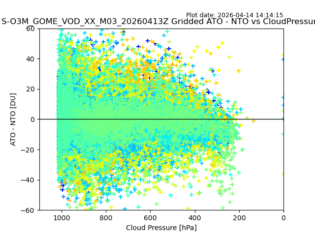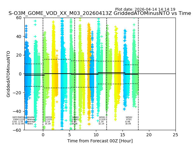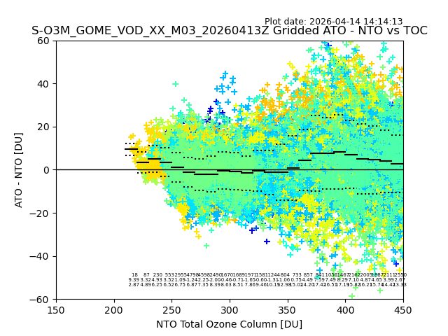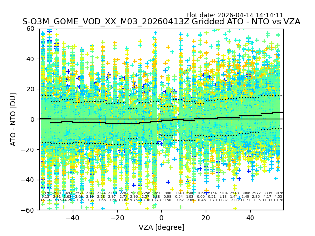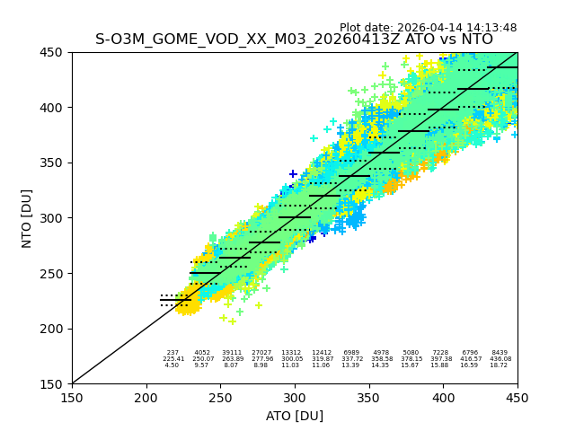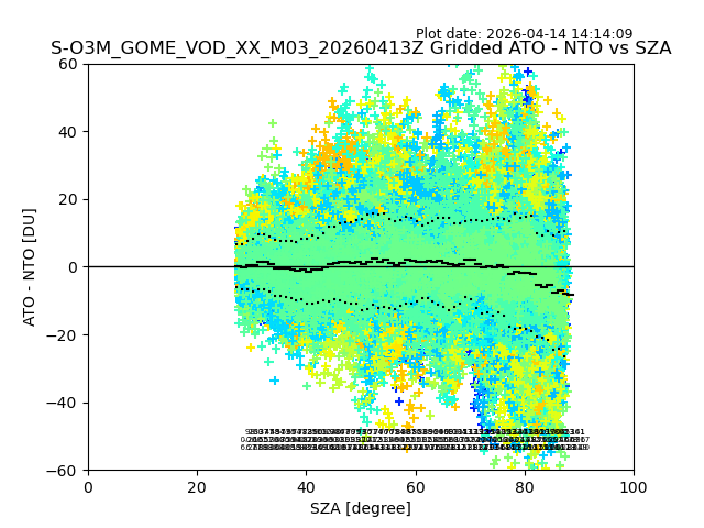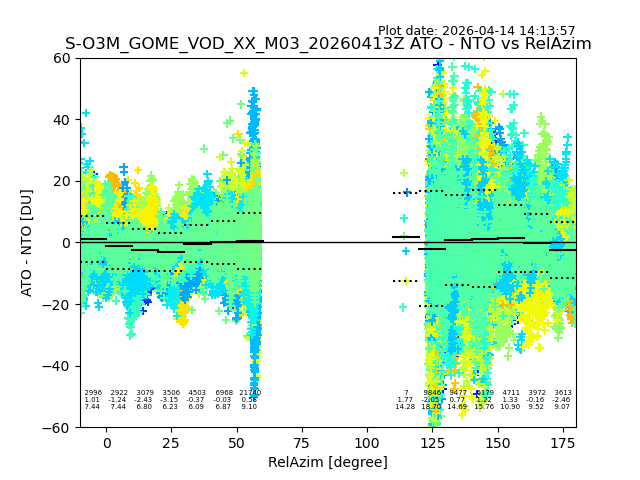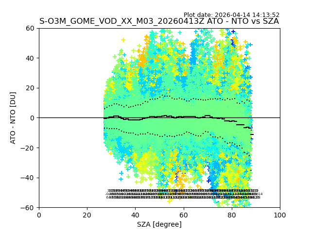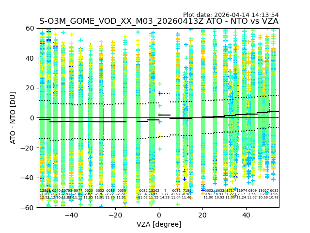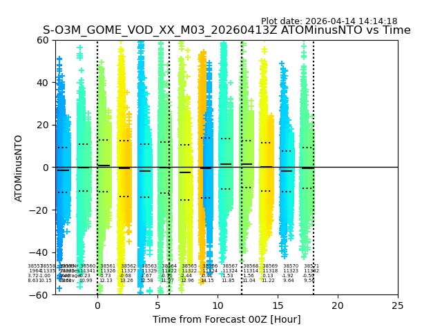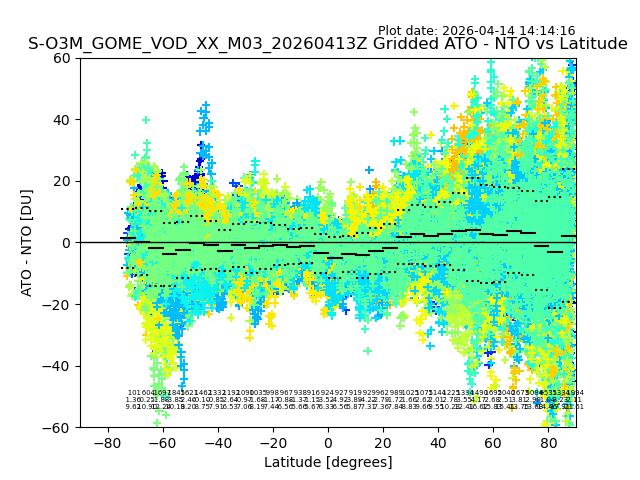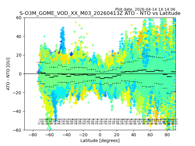 The date given in the title of the plot indicates the T=0 day for which the NTO/O3 data is compared. Example: S-O3M_GOME_VOD__M02_20110117Z indicates that the plot is for data from 2011-01-17 00:00 up NTO/O3 files starting at 2011-01-17 23:59 is used.