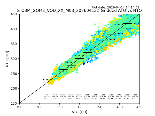 Using these forecast fields, the actual measured NTO/O3 from T=0 to T+24h can be compared. The comparison can be between each individual NTO/O3 retrieval and the ATO value in the associated grid box, or between 'pre-gridded' NTO/O3 values and the ATO value. Both these comparisons are given.