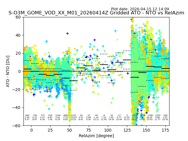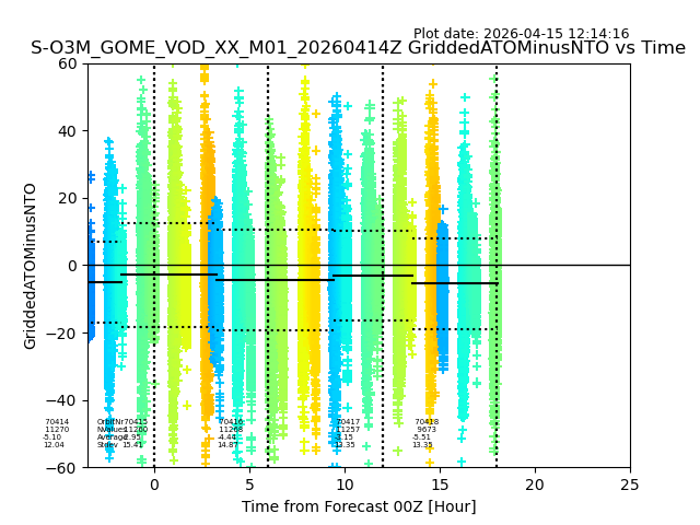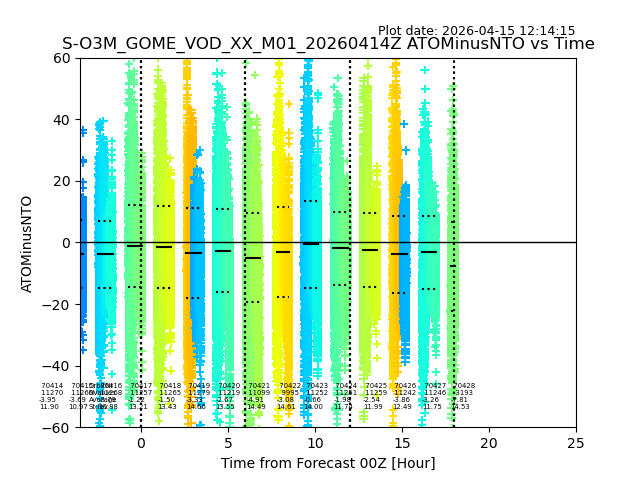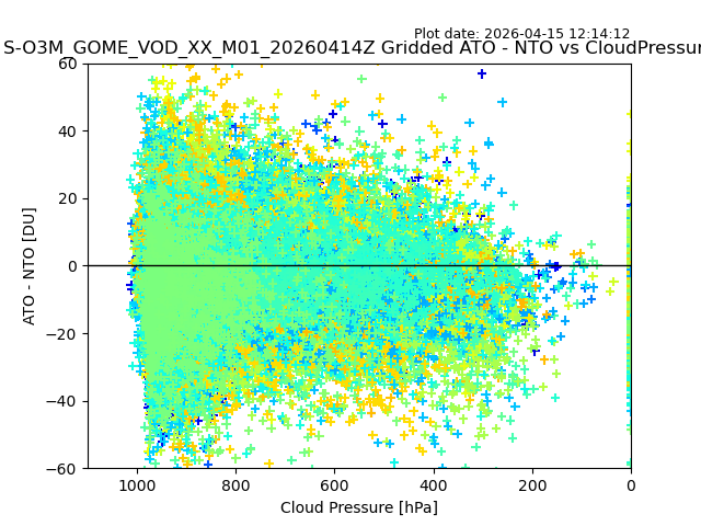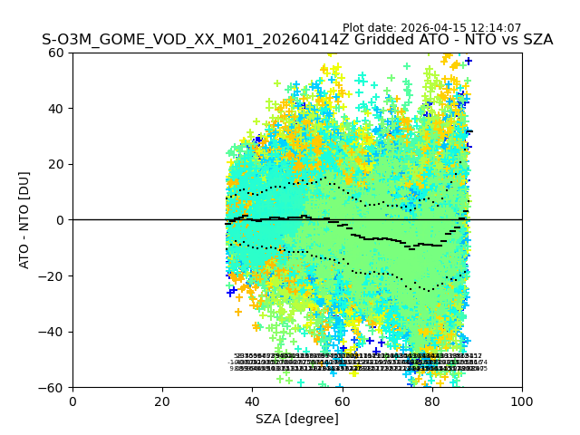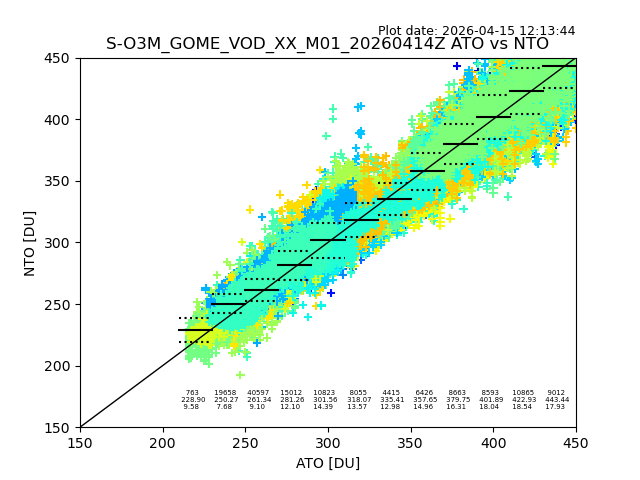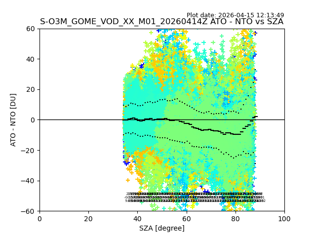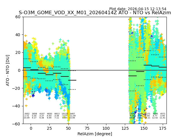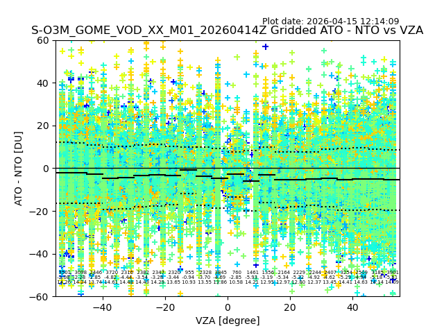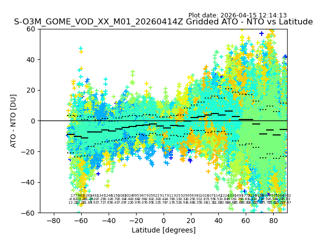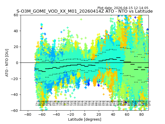 The date given in the title of the plot indicates the T=0 day for which the NTO/O3 data is compared. Example: S-O3M_GOME_VOD__M02_20110117Z indicates that the plot is for data from 2011-01-17 00:00 up NTO/O3 files starting at 2011-01-17 23:59 is used.