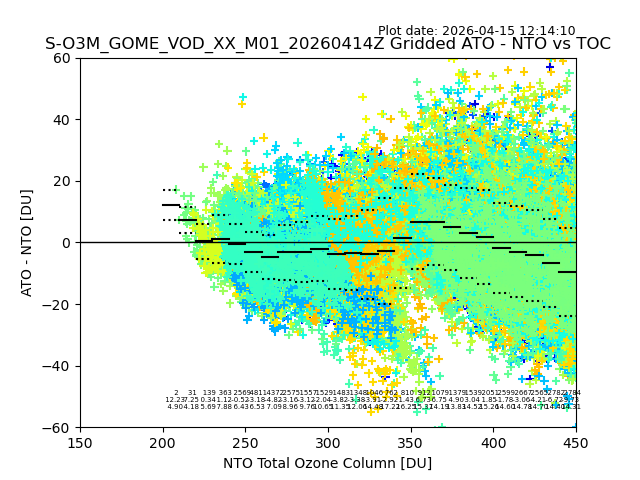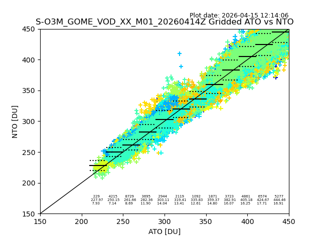 Using these forecast fields, the actual measured NTO/O3 from T=0 to T+24h can be compared. The comparison can be between each individual NTO/O3 retrieval and the ATO value in the associated grid box, or between 'pre-gridded' NTO/O3 values and the ATO value. Both these comparisons are given.