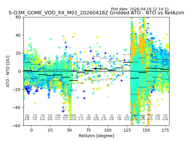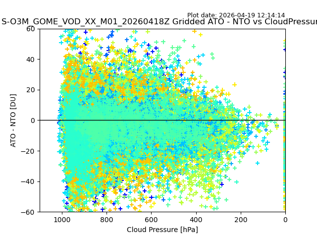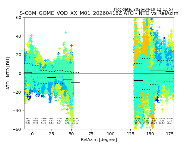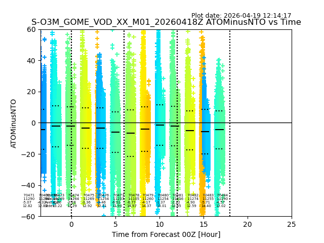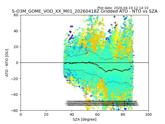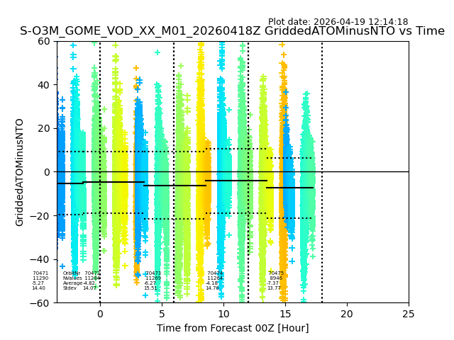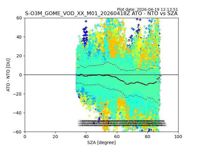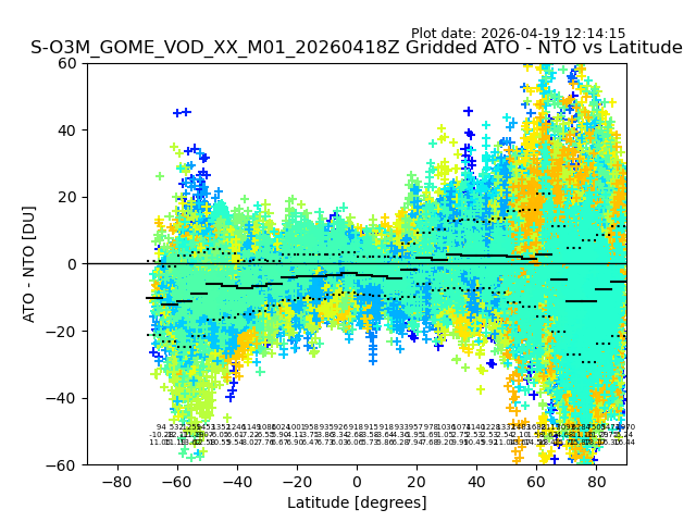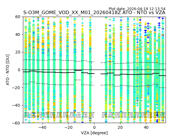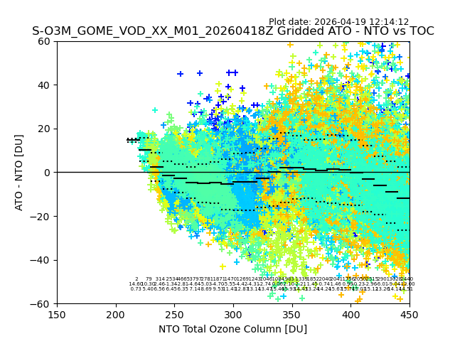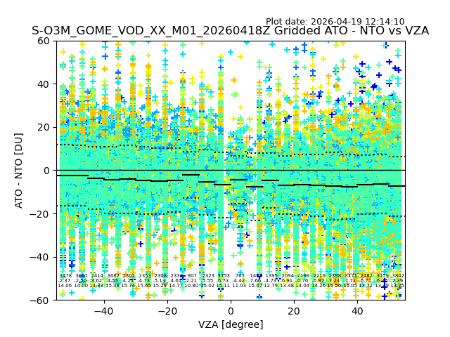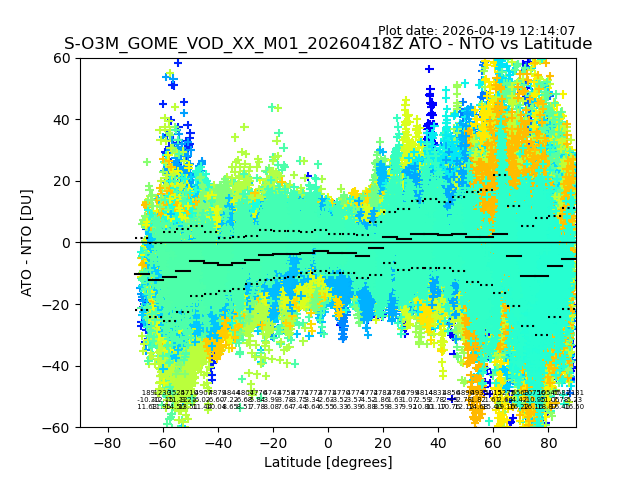 The date given in the title of the plot indicates the T=0 day for which the NTO/O3 data is compared. Example: S-O3M_GOME_VOD__M02_20110117Z indicates that the plot is for data from 2011-01-17 00:00 up NTO/O3 files starting at 2011-01-17 23:59 is used.
