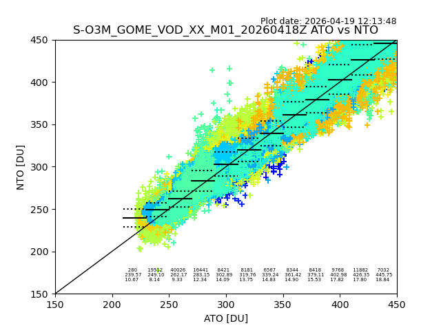 Using these forecast fields, the actual measured NTO/O3 from T=0 to T+24h can be compared. The comparison can be between each individual NTO/O3 retrieval and the ATO value in the associated grid box, or between 'pre-gridded' NTO/O3 values and the ATO value. Both these comparisons are given.