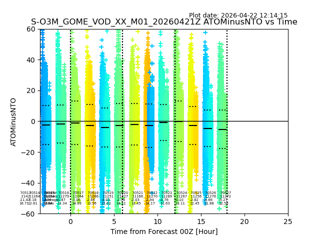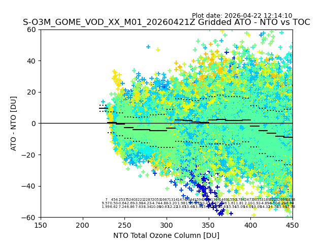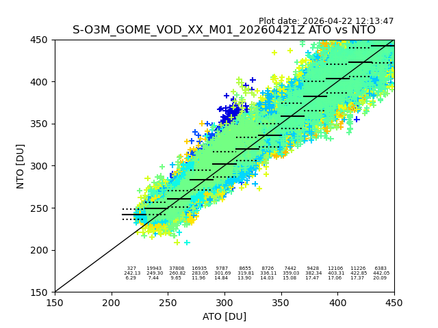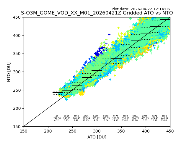 Using these forecast fields, the actual measured NTO/O3 from T=0 to T+24h can be compared. The comparison can be between each individual NTO/O3 retrieval and the ATO value in the associated grid box, or between 'pre-gridded' NTO/O3 values and the ATO value. Both these comparisons are given.