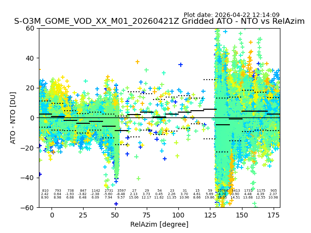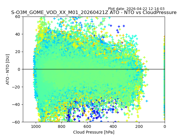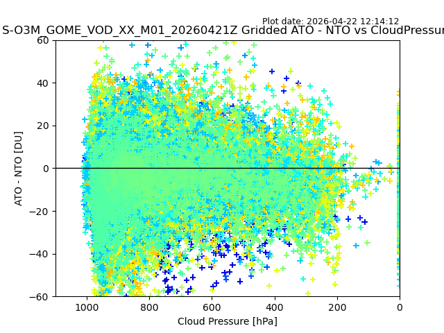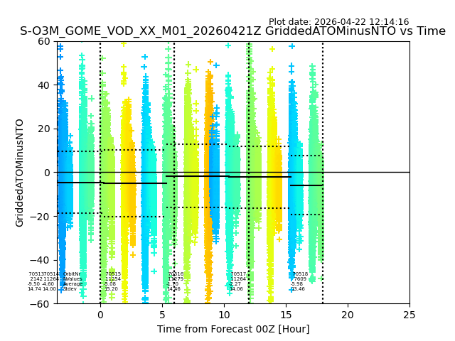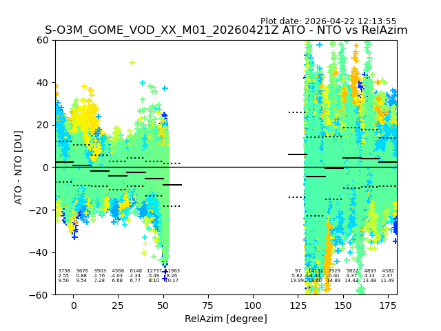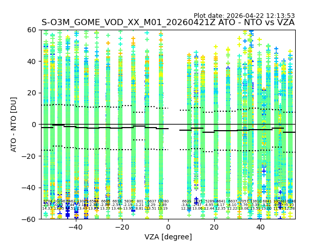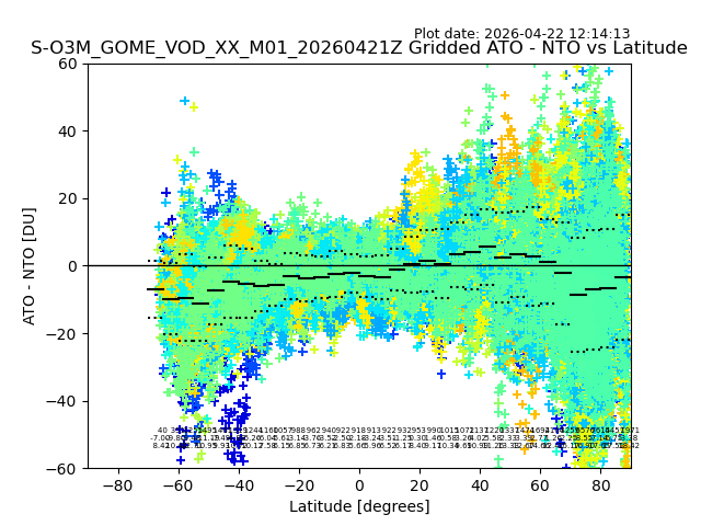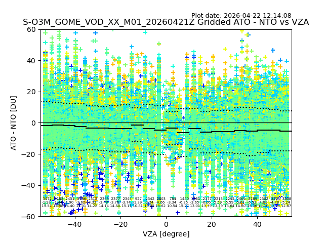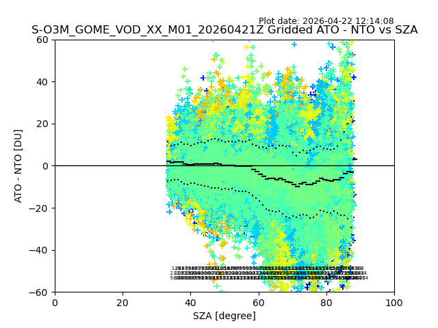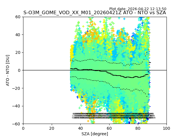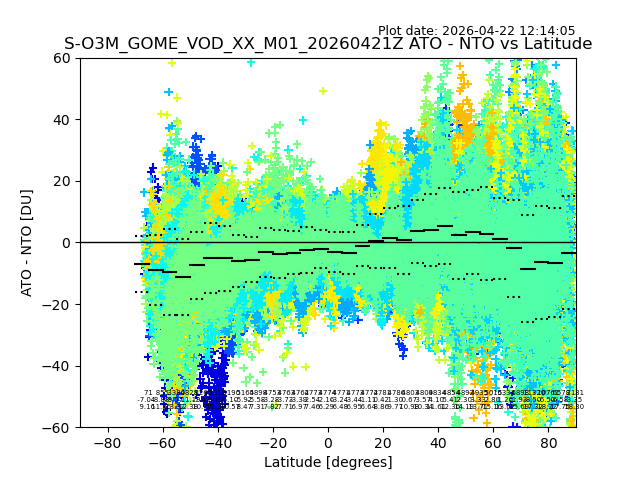The date given in the title of the plot indicates the T=0 day for which the NTO/O3 data is compared. Example: S-O3M_GOME_VOD__M02_20110117Z indicates that the plot is for data from 2011-01-17 00:00 up NTO/O3 files starting at 2011-01-17 23:59 is used.