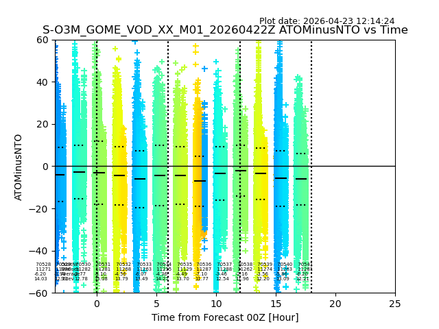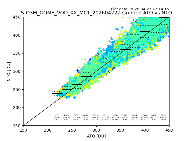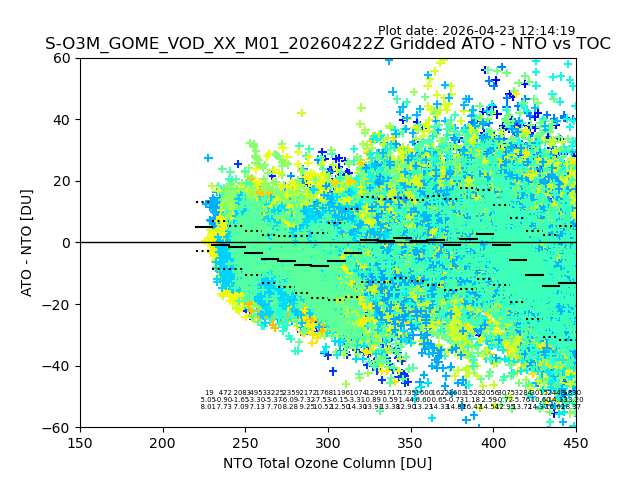 Using these forecast fields, the actual measured NTO/O3 from T=0 to T+24h can be compared. The comparison can be between each individual NTO/O3 retrieval and the ATO value in the associated grid box, or between 'pre-gridded' NTO/O3 values and the ATO value. Both these comparisons are given.