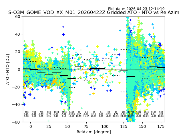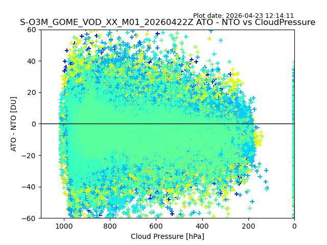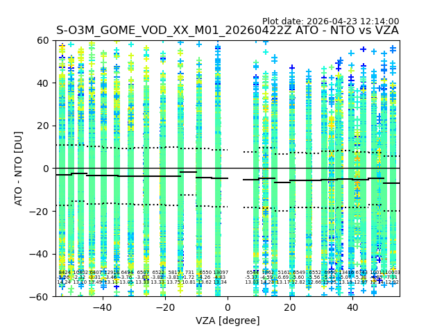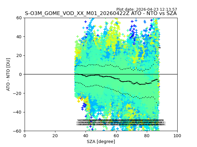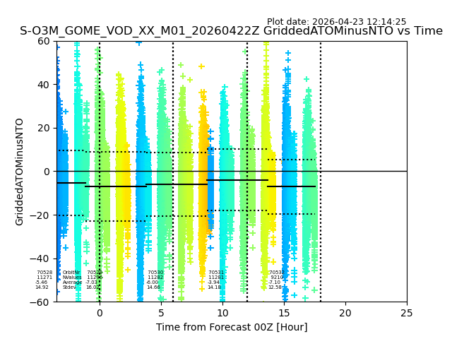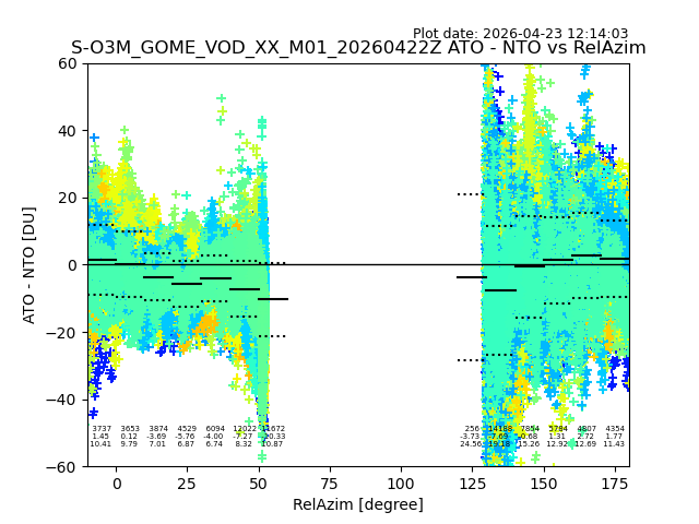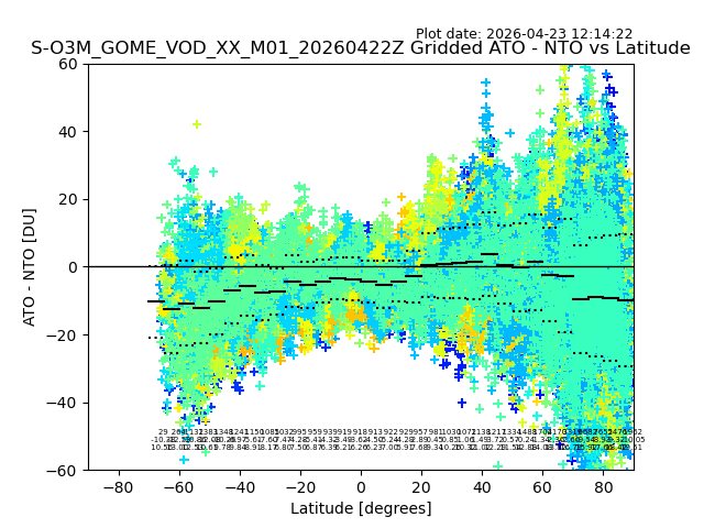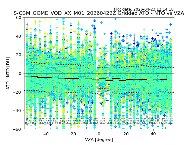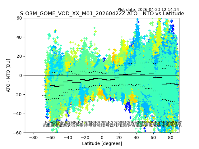 The date given in the title of the plot indicates the T=0 day for which the NTO/O3 data is compared. Example: S-O3M_GOME_VOD__M02_20110117Z indicates that the plot is for data from 2011-01-17 00:00 up NTO/O3 files starting at 2011-01-17 23:59 is used.