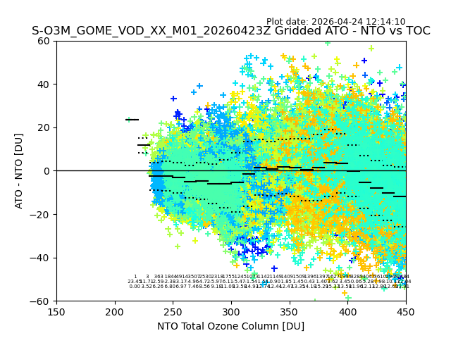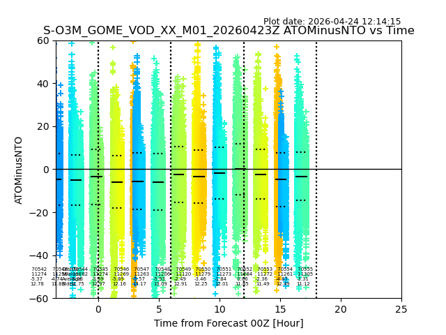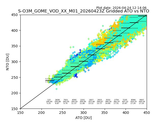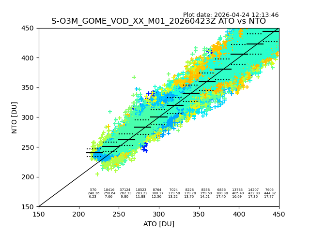 Using these forecast fields, the actual measured NTO/O3 from T=0 to T+24h can be compared. The comparison can be between each individual NTO/O3 retrieval and the ATO value in the associated grid box, or between 'pre-gridded' NTO/O3 values and the ATO value. Both these comparisons are given.