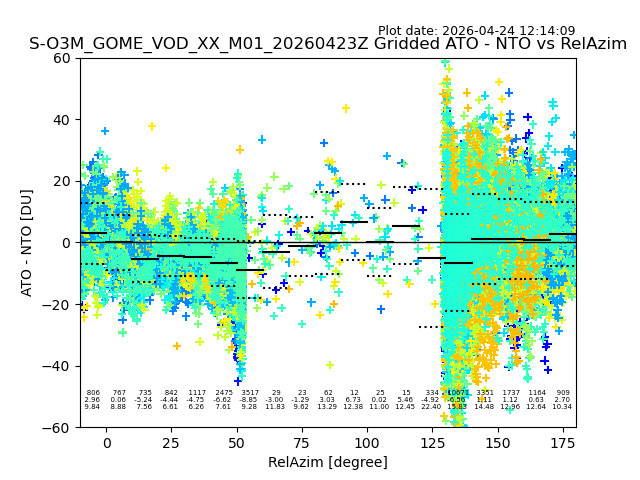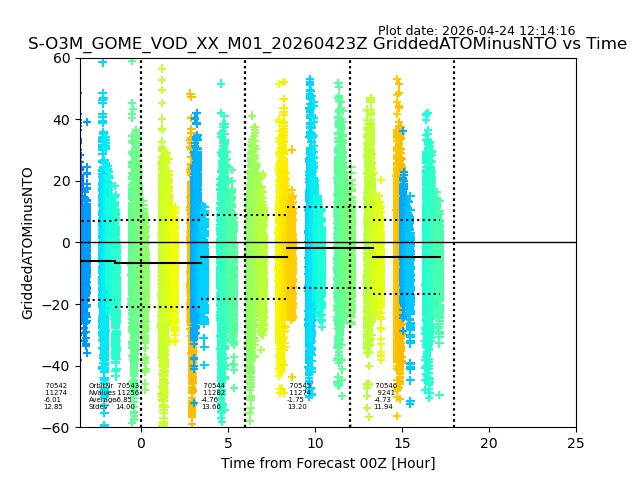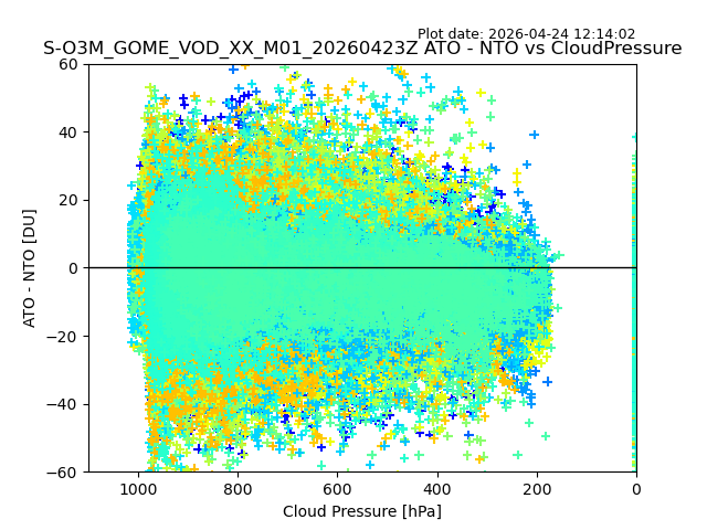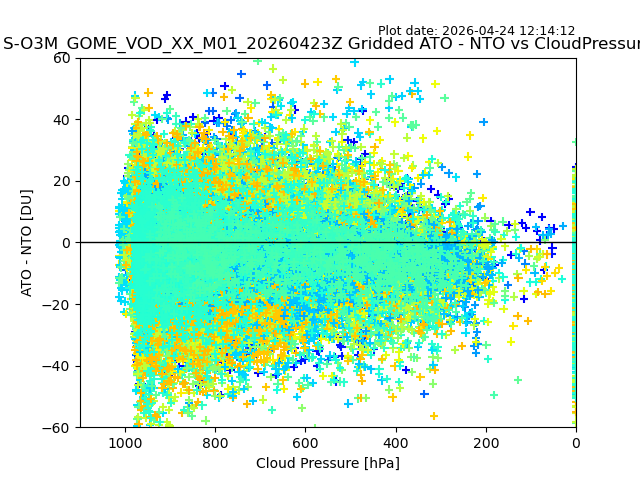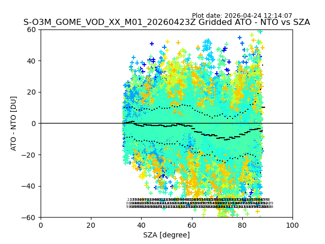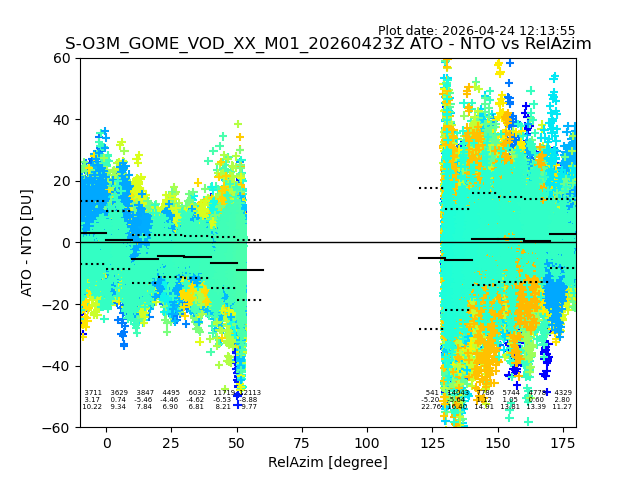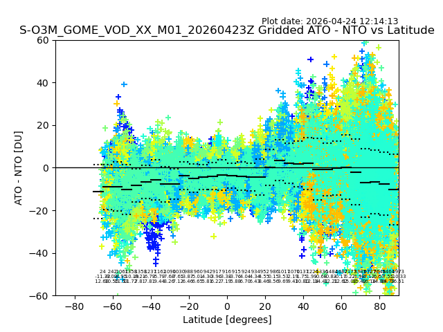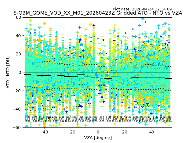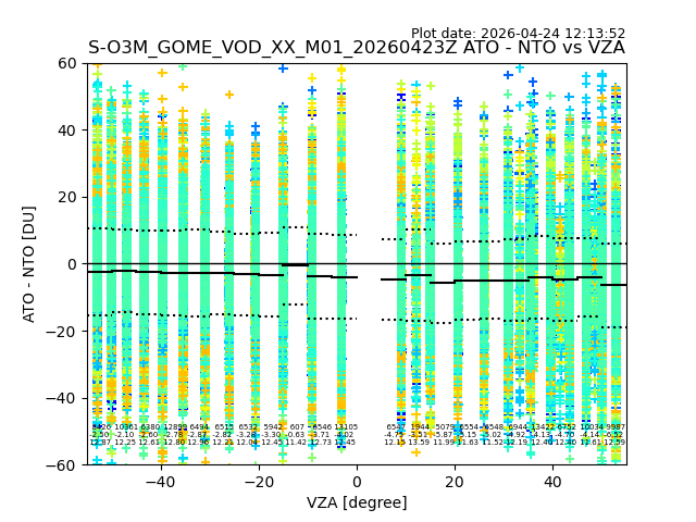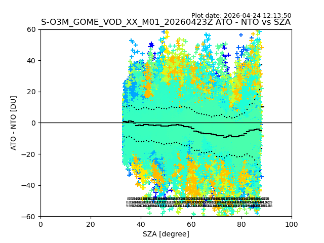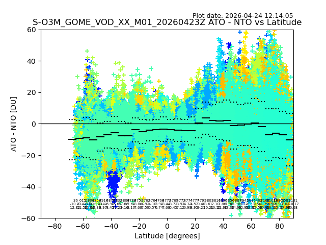 The date given in the title of the plot indicates the T=0 day for which the NTO/O3 data is compared. Example: S-O3M_GOME_VOD__M02_20110117Z indicates that the plot is for data from 2011-01-17 00:00 up NTO/O3 files starting at 2011-01-17 23:59 is used.
